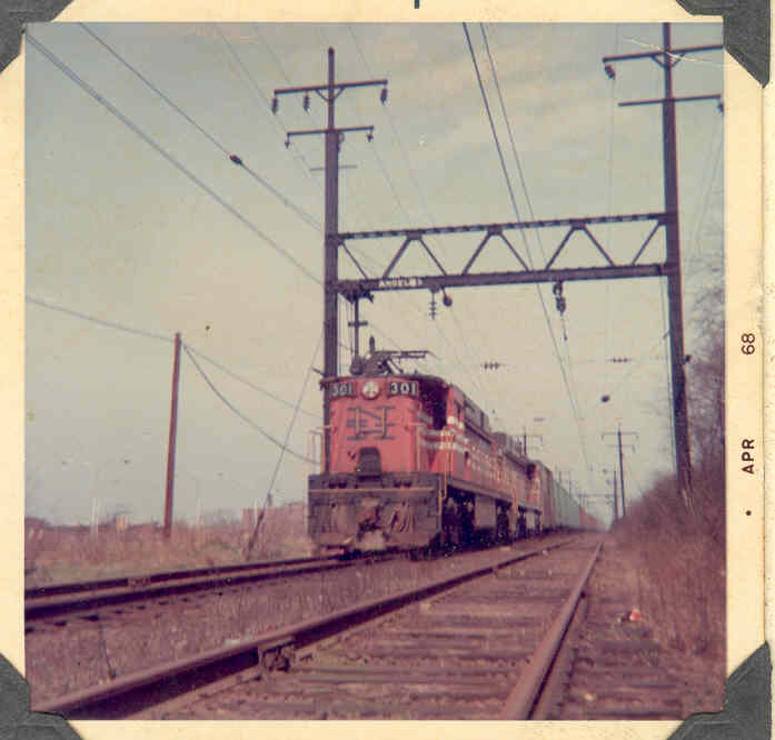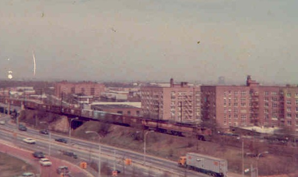 You can't really tell from the photo, but those are New Haven DL-701's pulling a northbound Penn Central freight through Queens, New York in May of 1969. It was really impressive to watch a NB and SB freight pass each other here, and I never caught it on film :-( The track is no longer a straight shot, as they curved the track maybe around~1997??? so they could straighten the terrible "S" curve on the BQE (on the very left of the photo).