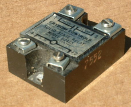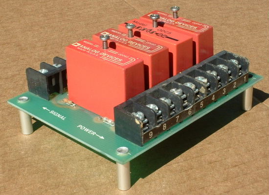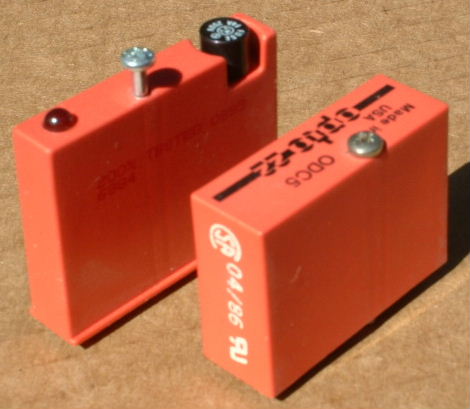 5.7 Of the three photos below, the left picture is an I/O board made by Opto-22, and can handle up to 4 of the modules. As used for this application, the inputs are to the left, the outputs are to the right.. The screws would normally be tightened all the way down, as the right module in the middle picture shows. Red modules indicate the modules are for DC outputs. Other colors (FYI) are black (AC output), yellow (AC input), and white (DC input). The output boards also come in 8 and 16 varieties. They can be found surplus at Hamfests, and can be gotten fairly cheap if the seller isn't trying to rape you (couple of bucks). The middle picture are two representative DC output modules. One has a mini-fuse protecting the output, and an LED informing you when it is activated. The black module to the right is an AC brick discussed as an output device in 5.8. The Lo-V input is the side closest to you, the AC output is on the far side. They can also be had cheap (a buck or two) at a Hamfest. You can check on Hamfests at: http://www.arrl.org/hamfests.html