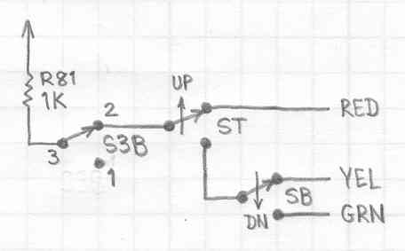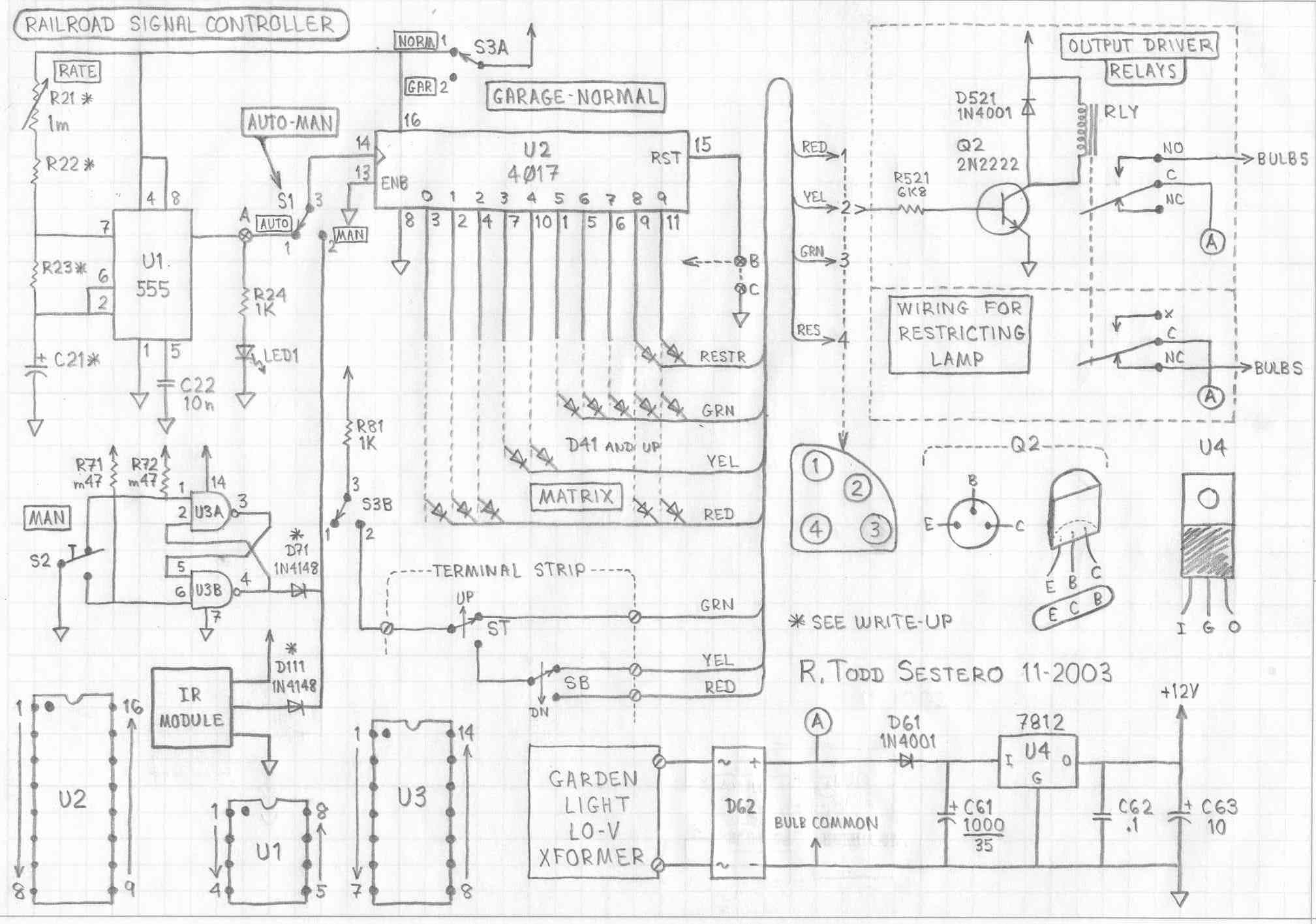 8.1 I came up with this circuit for a friend of mine who has a Pennsy dwarf sitting in his front yard, and wanted the signal to work with the garage door. The two micro-switches, ST and SB, form a switching network to drive the “GRN”, “YEL”, and RED aspects of a signal to denote whether the door is up, down, or “in-the-middle”. Switch S3 selects whether or not this circuit is active. When thrown to position 2, it connects the micro-switches and disconnects U1 and U2 so they can not interfere with the garage door operation. Wiring is straight forward. Diodes are not needed to OR the control lines with those coming from the 4017, since the IC is disabled during garage operation.