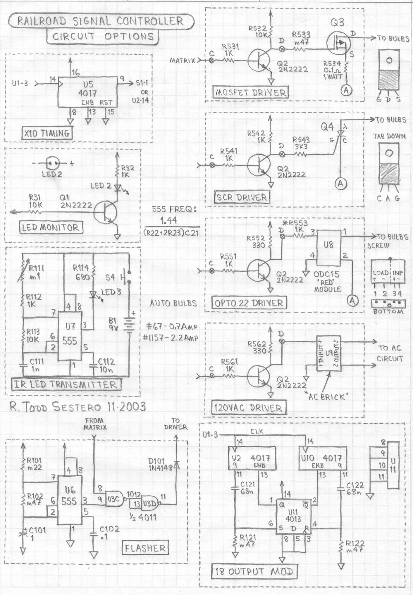 1.5 If you want to build this controller in its simplest form, you only need what's in the block diagram. With this minimum configuration, you have up to 10 time slots and/or aspects that can be displayed. The number of output driver circuits you need to build will depend on the number of different aspects your signal requires. For instance, a standard three color light signal needs three output drivers. A searchlight signal only needs two drivers. A Pennsy position light signal needs as few as two or three, depending on how many positions it has, but can go up to five drivers if you have a full head and want to display the more obscure aspects like “lower the pantograph”. If you are lucky to have two Pennsy signal heads, there are 13 aspects possible, 15 if you include the two obscure ones (which I have never seen). There are 16 aspects for a full B&O CPL signal (including the 6 markers lamps), and two of the aspects employ flashing markers. And lastly, depending on the road, there are around 12 aspects for a full 3 head color light installation.