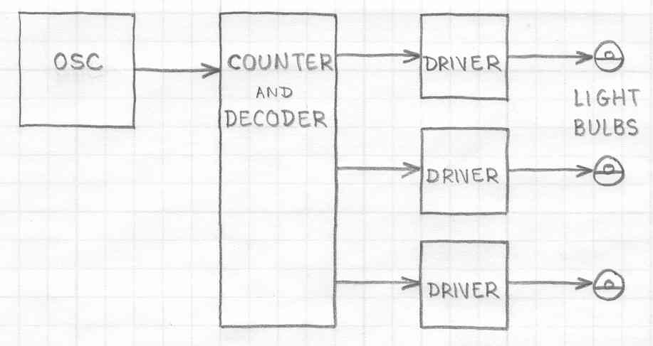 1.1 The signal controller circuit is pretty simple. It can be broken down into three basic sections, as shown below: 1) the oscillator, 2) the counter/decoder, and 3) the driver circuits.