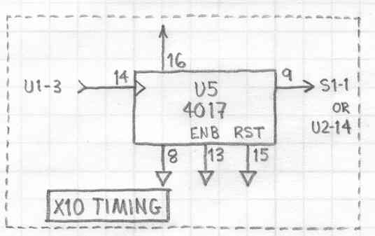 12.2 Any pins not shown on the 4017s remain connected as before. Keep both resets wired to ground. If you need to shorten the count cycle, move C122 (the “R” input lead) to another output pin of U10. Basically, U11 is wired as a set-reset flip-flop, with the output pulses coming from the two 4017s used as the set and reset controls. As soon as U2 gets to output 9, it sets the flip-flop so the “not-Q” output goes low, which then enables the second decoder U10. When U10 gets to output 9, that output pulses the reset input of U11, and makes the “Q” output go low. The enable inputs need to be low in order for the 4017 to count and have an output. Make sure all of U11's unused inputs are wired to ground as shown on the schematic. The R-C network on the 4017 outputs change a constant output to a pulse going into the U11 inputs, otherwise U11 would lock up! The values of C121 and C122 can be anything from 0.01uf (10n) to 0.1uf. Likewise, the R values can be almost anything from 100k to 680k or so. I stuck the R’s and C’s in there that I had laying around the bench, and they worked (some circuit design isn’t rocket science!).