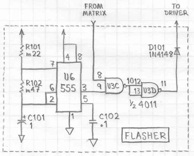 10.2 Make sure you use a diode (D101) on the output if you plan on having the flasher circuit drive an output circuit that is also controlled directly from the matrix, otherwise, you can leave it out.