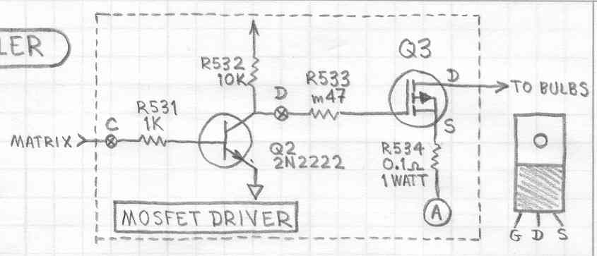 5.3 OPTION 1 -- This output circuit using power MOSFETs is pretty simple. MOSFETs are voltage devices, so you can change the current rating of the device without having to change the input resistor. The only problem with MOSFETs are, without a current limiting resistor in the source (or drain) lead, a bulb that decides to end it’s life by “blowing”, could also take the MOSFET with it (if the surge when the bulb shorts exceeds the devices’ power dissipation limits). The choice of including the current limit resistors is up to the user, depending on availability, price, and the chance he wants to take! The circuit is similar to the relay driver, except a protection diode is not needed. I would recommend a 0.1 ohm resistor rated at 1 watt. A 2 amp bulb will dissipate approx 0.2v and 0.4 watts across the resistor. These drivers need the bridge rectifier. Q2 can be left out for the normal aspects, with the matrix being connected directly to point "D". Q2 is an inverter, and only needs to be used to invert the drive signal for the restricting driver.