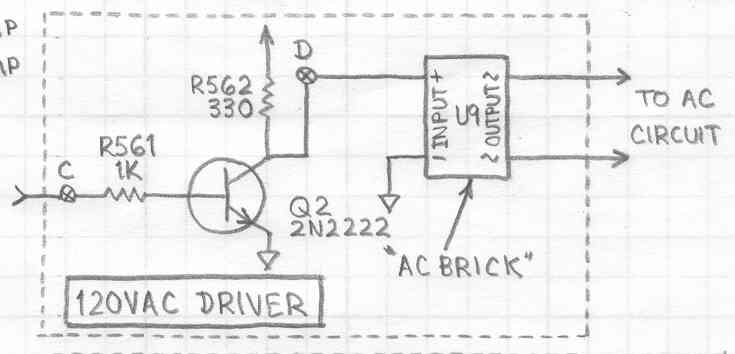 5.8 OPTION 5 -- This option is mostly for those of you who are also traffic light weenies, altho I recently found out that some New York City style subway signals operate off of 120VAC too. This output circuit is for driving 120vac light bulbs, using commonly available “bricks”. The bricks contain all of the necessary isolation, driver, and TRIAC stuff inside them. Some even use zero-crossing to help cut down on RF hash (noise) on the AC line. Connections are simple: there are two terminals for the input, which is usually 3 to 28/32vdc, and two terminals for the AC output. Just be careful when wiring the AC side! Again, Q2 can be left out for the normal aspects, with the matrix being connected directly to point "D".