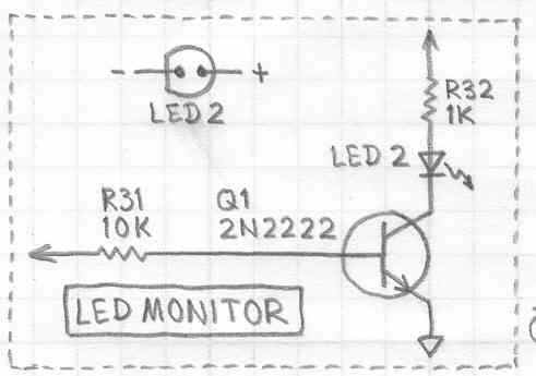 13.3 As in paragraph 2.3, I like to see what’s going on in my circuits. So I offer another simple LED monitor circuit that can also be used as a trouble shooting aid. It’s a simple transistor amplifier. Apply a high (+12vdc) signal to the input side of R31, and the LED comes on. I have mine permanently connected to pin 2 (the “1” output) of the 4017, now that I’m done building the circuit (I figure most signals have at least 2 aspects, or why bother building this circuit?)