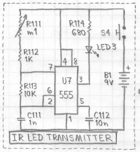 11.2 In case you can’t find a single function remote control, I have included a simple circuit for driving an IR LED. It uses that all purpose 555 again. You can adjust the frequency in one of three ways. The easiest way is to connect a frequency counter to pin 3 and adjust R111 for 40KHz. You can also connect a scope to pin three and adjust the period for 25us. Lastly, connect the LED monitor circuit of paragraph 3.2 to the output of the receiver module. Press the push button on the transmitter, and adjust R111 until the LED lights up. There will be a range to the adjustment, so count the number of turns from the point where it comes on, until it goes out. Divide that number by two, and then use that new number of turns to go past the point where the LED first comes on. The frequency should now be pretty close to 40KHz. At the very least, it should be at the peak response of the IR receiver.