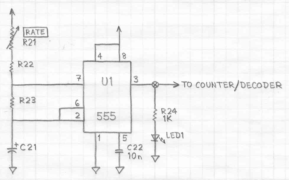 1.2 As mentioned before, the oscillator (aka: clock) uses a 555 timer chip. It is wired as an astable multivibrator (it just sits there and oscillates till time itself stops). It's a standard circuit, and pretty much right out a data book.