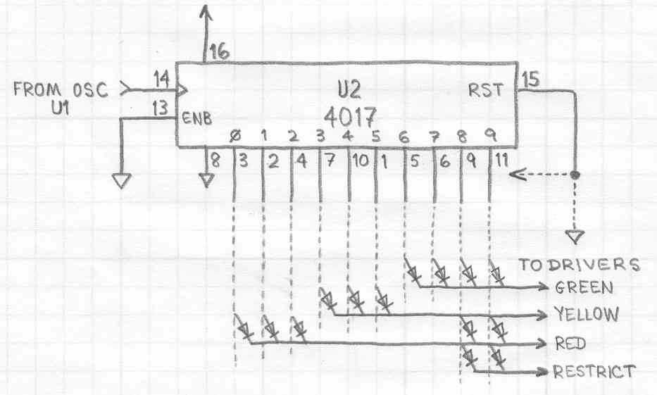 3.4 Pin 15 is the reset input, and if you are not going to use it, it must be grounded. So, how does one choose to reset or not? It comes down to how you want the aspects to display. If you have a 3 aspect color light signal, and you want green, yellow, and red all to have the same ON period, then use outputs 0, 1, and 2 to drive the three drivers, and attach pin 15 to output 3 (pin 7). If you want the three colors to have a different ON period, then use all of the outputs, and adjust the ON time by connecting diodes between the appropriate output and driver to suit your needs. As shown in the above schematic, red and yellow will be on for three periods, and green and restricting will both be ON for two periods. You could also, if you are modeling the Baltimore Light Rail system, have red and yellow on at the same time (red over yellow, since they are stupid and put the red on top - signals that do this are on both tracks, southbound coming into the North Avenue station). If you use all ten outputs, ground pin 15.