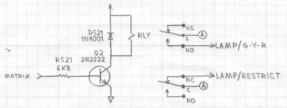 5.2.3 One last note about the drivers. The transistor in the relay driver doesn’t need to be rewired if used to drive bulb 4 for the restrictive aspect. Only the contacts have to be changed from using the NO contact to the NC contact (I know, I’m repeating myself). This is because we want the relay to turn OFF the bulb, instead of turning it on. For all of the other circuits that use solid state output devices, the transistor is used only to invert the control signal, so it accomplishes the same thing. If you want to use the solid state drivers, and you only want to turn bulbs ON, do not use the transistor. Instead, connect the output of the matrix to point "D" in the driver circuit. If the circuits don’t seem to work at first, you may need to adjust the resistor values a bit. Don’t be afraid to try different values as long as you don’t go to extremes (especially when using smaller values), in other words, don’t throw a 10 ohm resistor in the circuit!