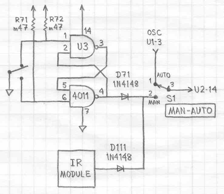 7.2 If you do not want to use this feature, you can eliminate S1, S2, U3, R71, and R72, and wire the output of U1 (pin 3) directly to the input of U2 (pin 14). You will still need U3 however, if you want to use the flasher option.