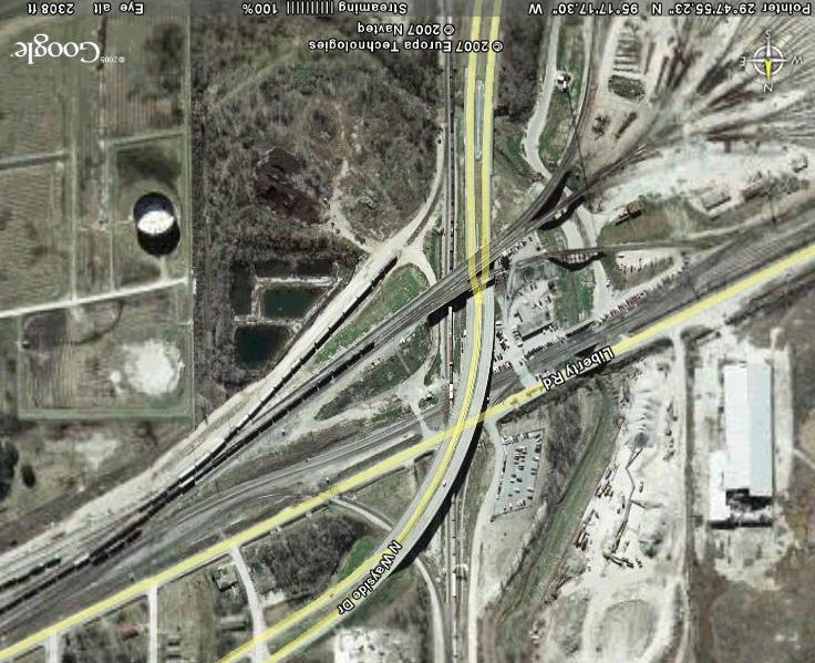 From the downtown area, I would come out of town on US59, heading north, and then take 610 east to exit 22, Homestead Rd. Take a right, and it will run into Liberty at the yard... take a left. When you come to a highway overpass, you're at the location. There's a grade crossing with the original UP line, and you should be able to pull off the road along Liberty.