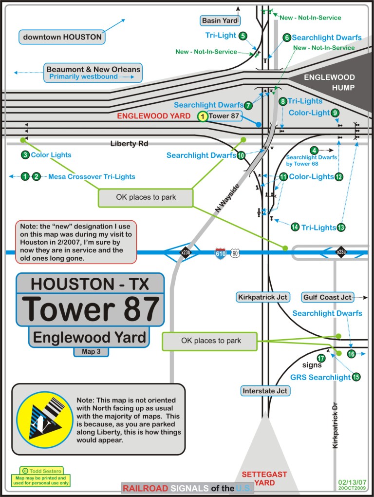 Below are a couple of maps; an area map of the northeast side of Houston, and a site specific map of the signals at Tower 87. There is also a snapshot of a Google satellite view of the Tower area. The map is oriented as you would be looking at the signals in Englewood yard from Liberty Rd. I also inverted the Google Earth map so it would be in the same orientation. In the picture and on the map, you will notice a dirt road that not only services the fenced in employee parking lot, but it goes on down to the frontage road that goes under I-610. Time was short the last time I was there, so I missed getting good pictures at all of the locations, if you can help out, it would be appreciated.