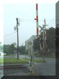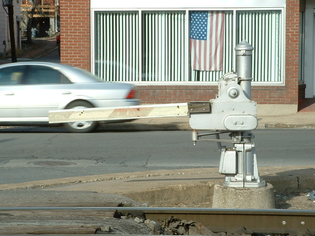 This crossing gate and it's brother are in Darby PA, a southwest suburb of Philadelphia. It protects people from freights on the old B&O, their only track in and out of town to the south. It is on Main St (cross street of N 6th St), not too far off of Island Ave, which is an exit off of I95. You can also see, especially in the streetcar shot, that the trolley tracks cross here too. What a great town! Sorry I didn't get more pix of it, the streetcar was coming for a photo run-by and then we had to get back on.