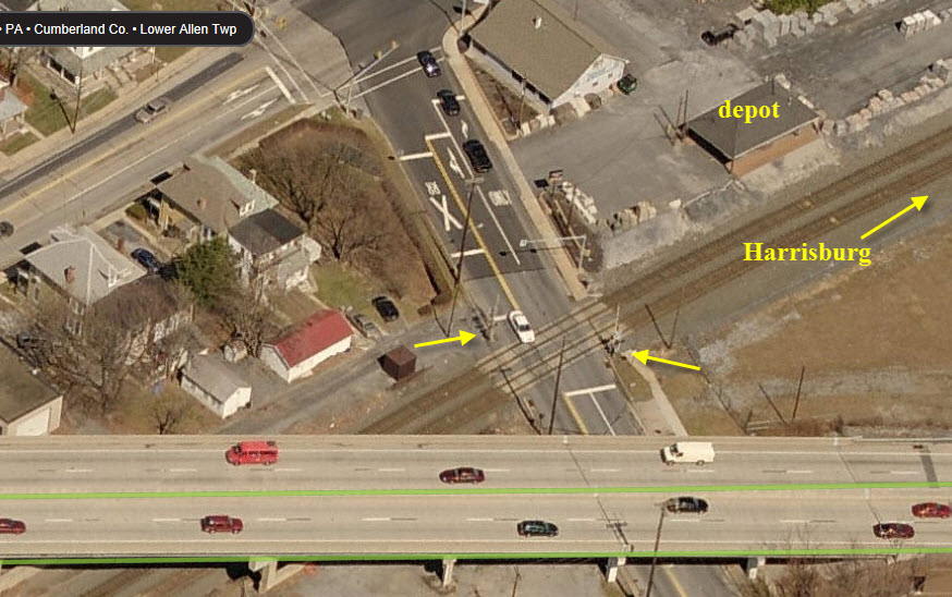 In this southern suburb of Harrisburg, adjacent to the Camp Hill depot and on the Lurgan Branch, is this grade crossing on the Norfolk Southern. It is fairly easy to get here off of I-83. See my railfan guide map for Harrisburg here.