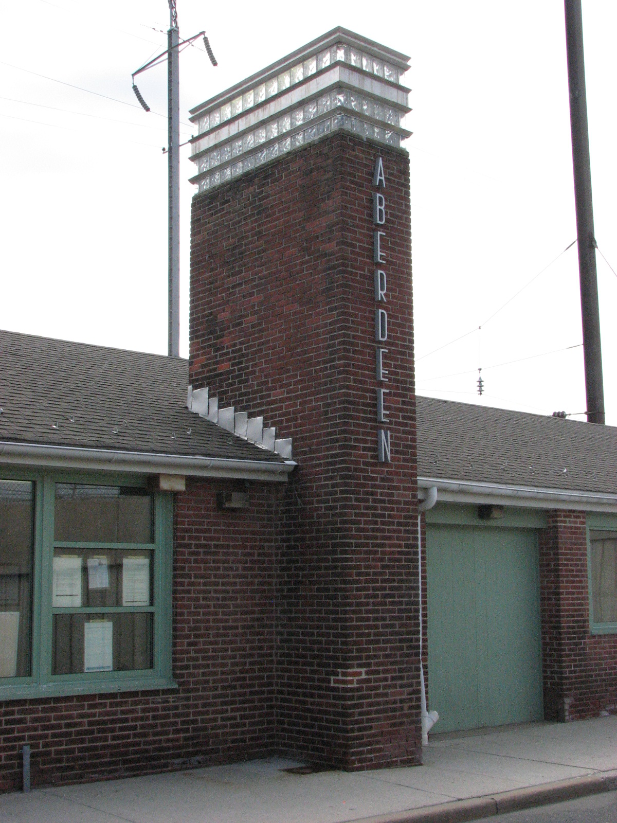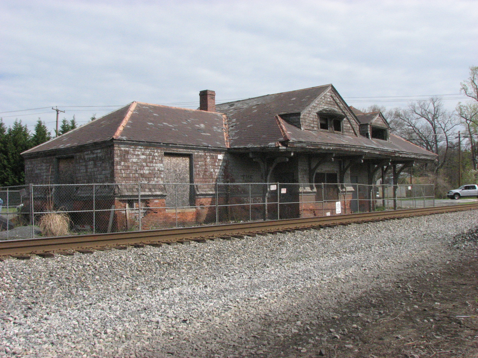 We headed up 95 and got off in Aberdeen, stopping off at the B&O depot designed by Frank Furness. This depot is in a bad state of disrepair, and they have been trying to get it saved for at least 5 years, when I worked at the APG and attended meetings held by Harford County on what to do with the station and how to do it. Since I was there last, several pieces of roof have fallen in. They are trying to get it moved a hundred feet or so from the tracks, and turn the former Aberdeen yard into a county park.