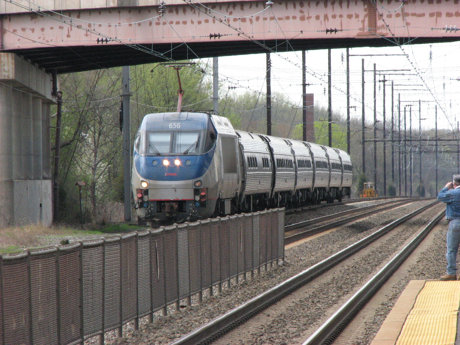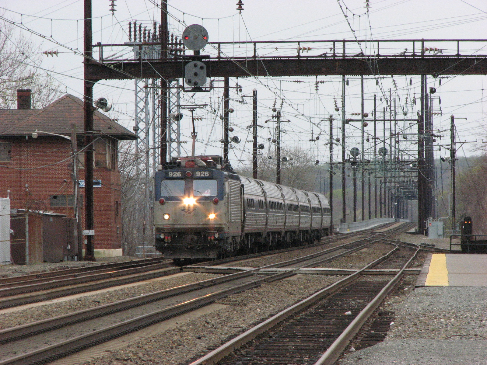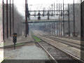 Next, we headed across town to the Amtrak/MARC station, where we took pix of the station, a NB passenger train headed by engine 656, and a signal bridge just north of the station at MP 65, with signals labeled "652" (NB) and "651" (SB). There are three signals for each direction. Map books aren't available for the Pennsy like they are for the B&O (thru the B&O Historical Society), so I'm ignorant of the Pennsy designations.