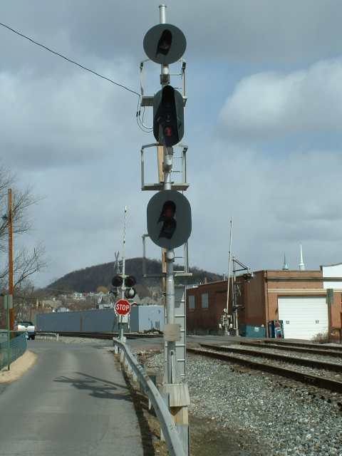 These two photos are on the CSX in Cumberland MD. The left one shows quite a mix, with single, dual, and triple aspect heads. Also, the head in the middle is probably a newer head, for it has a narrow background compared to the other two, and it has the Darth Vader hood. Even though it looks like a newer installation because of the pole, this was probably on the Western Maryland and they re-used the top and bottom heads, as the WM was a big believer in using the wider backgrounds. The pix on the right is on a three track ex B&O main in town and shows the use of red in the top position.