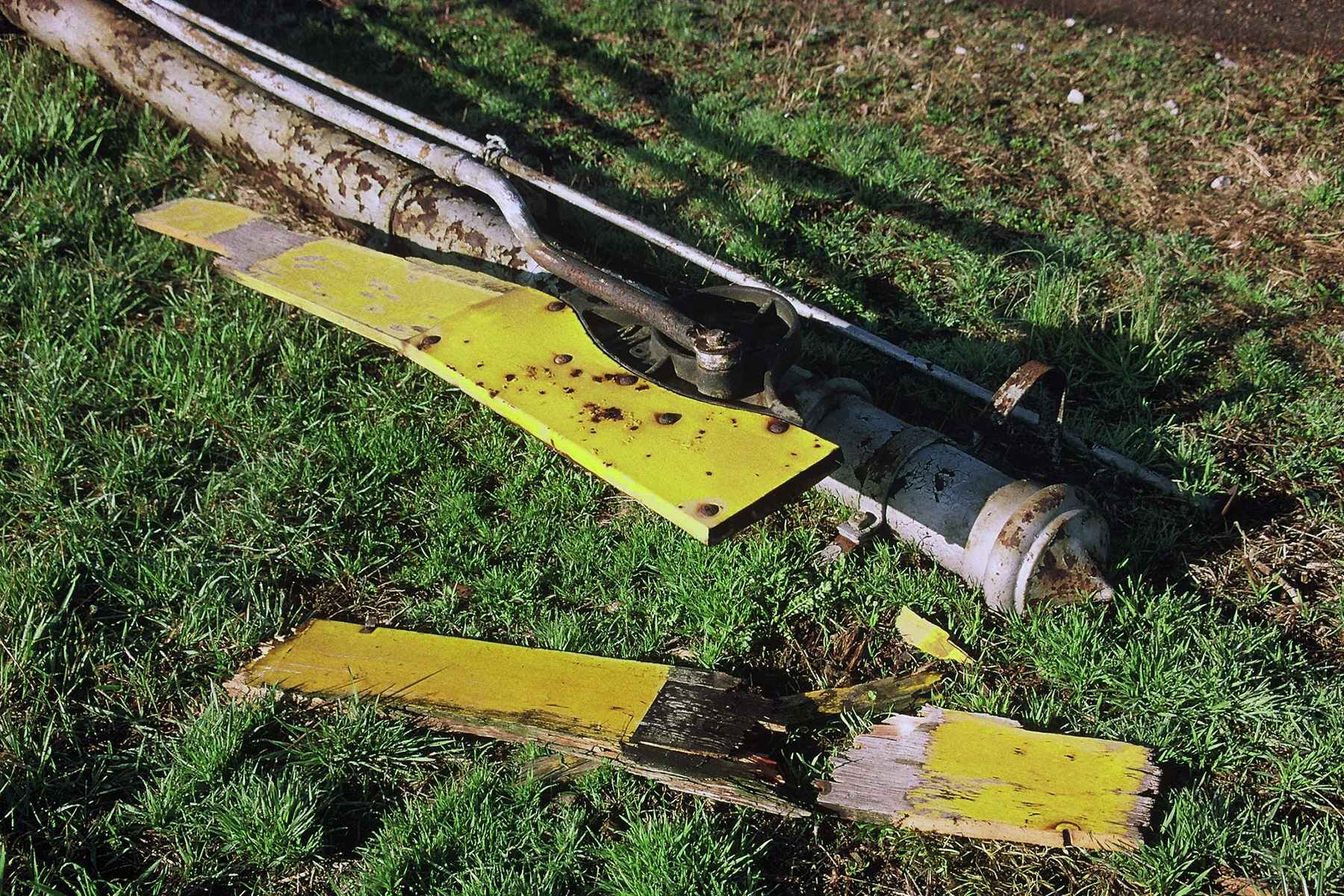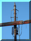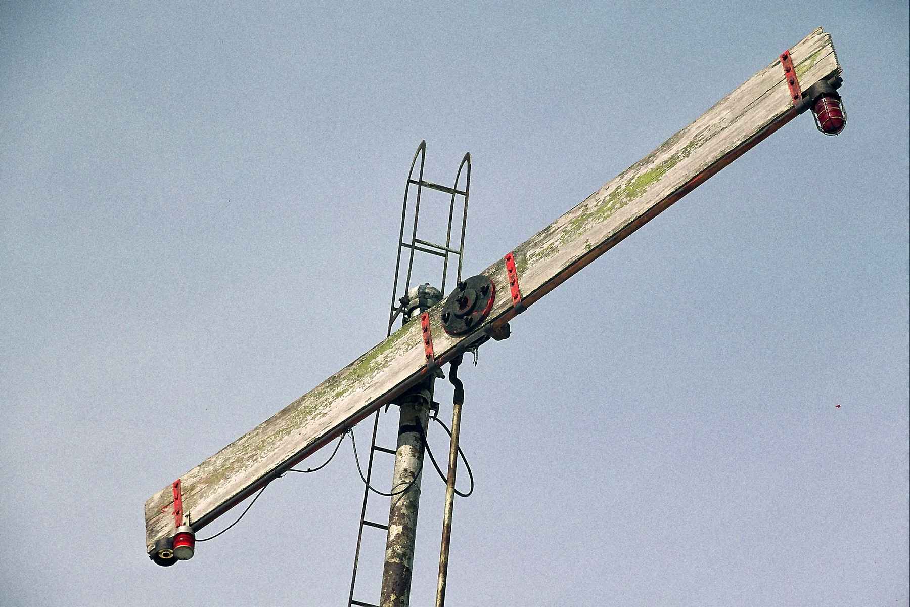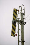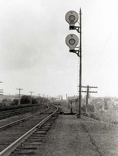 Banjo signals were failsafe, and operated magnetically. The clear banner would be pulled into view by an electromagnet, and when de-energized, would allow the clear disc to fall out of sight by gravity. The two "lenses" were attached to the same arm so they would move together - the arm also (usually) had a counterweight. Since the larger one was heavier, the pivot point was placed so it would let gravity act on it, pulling both discs out of sight. According to Solomon, two magnets were used, one to move the lens into position, and another to hold it in place (similar to the operation of a semaphore, where a lesser current was used to maintain the semaphore in position once pulled into place using a larger current). Thanks to John Ingham of the U.K. for correcting my oversight on Banjo signals not being failsafe.