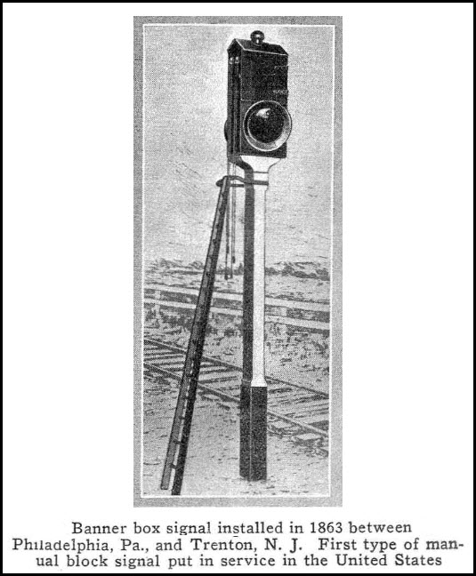 Because Banjo signals were only two aspect, they were usually used in pairs on the mainline, one used as a home signal and the other a distant, or approach signal. If the next signal was showing a red (we call it stop, but back then it was called a danger signal), the distant signal would display a blue, which was common in those days for that aspect. The picture below from the Reading has obviously been updated to show the "newer" colors. Also remember that back in the very early days of railroading, a clear signal was usually indicated by white, and not green.
