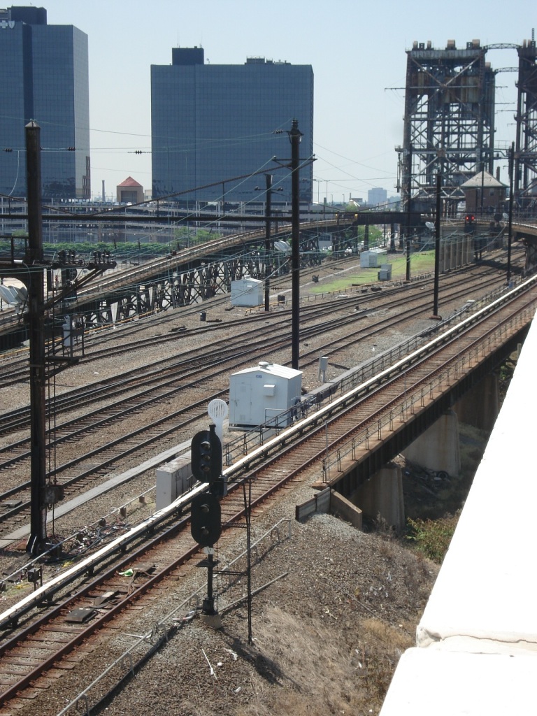 Below are pictures of the surviving smashboard in Newark on the PATH tracks, and there is a parking lot next to the track where these pictures were taken from. The high rise building to the left of the bridge in the second photo is the NJT Headquarters building; we're looking east, or south. A BIG THANKS goes to Rich W. for taking the time to go out and take these pictures for me!!! The accompanying colorlight signals are also pretty old!