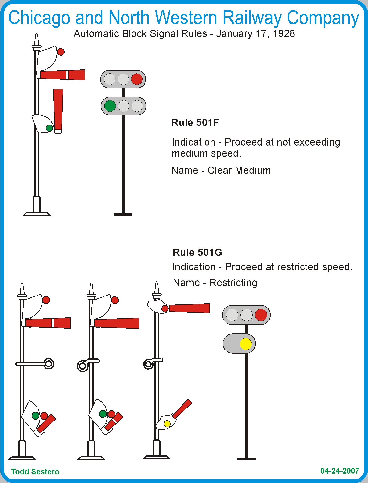 The CNW laid out it's rulebook a little differently than what we are accustomed to today. First, all of their rules covering a certain type of signal all fell under the same rule number, but had a different letter designation, Second, they divided the sections in 501 for Automatic Block Signal Rules.... section 502 for "Banjo" signals.... section 601 for Interlocking Signal rules, altho there is a second set of rules for 601B and 601C to cover signals with Smashboards.... section 602 covered lower quadrant semaphores.... and section 603 covered different set of semaphore signals.